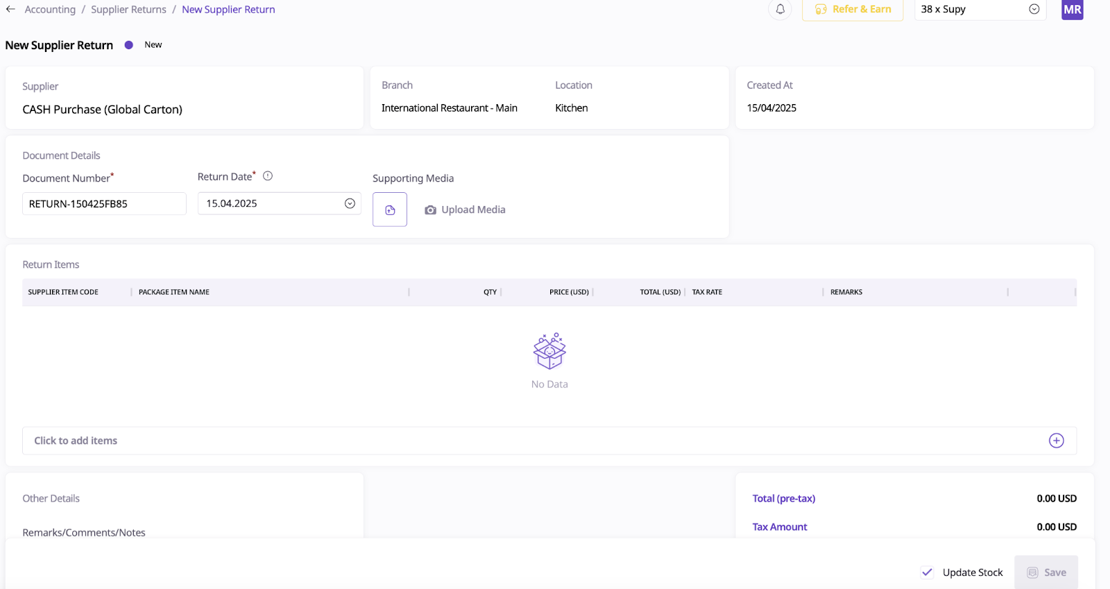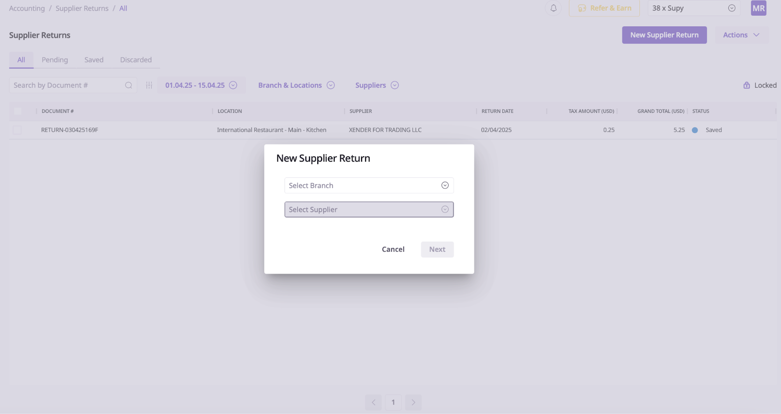 Creating supplier returns in Supy is a simple process that allows you to manage inventory adjustments and accounting efficiently. Follow these steps to complete a supplier return: