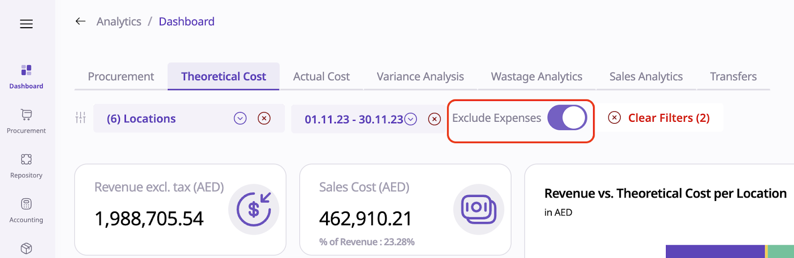 The cost dashboards exclude expense cost by default. When disabling this "Exclude Expense" toggle, the expense cost will be included along with the COGS.