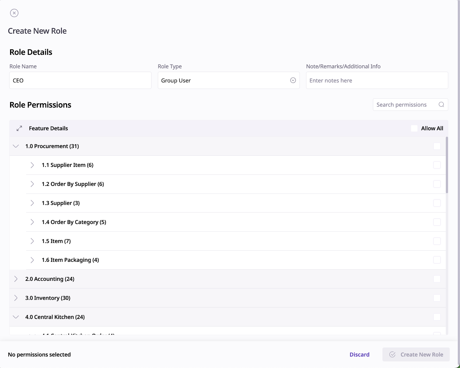 Feature Access: Select the features accessible for the role, such as Procurement, Accounting, Inventory, and more.