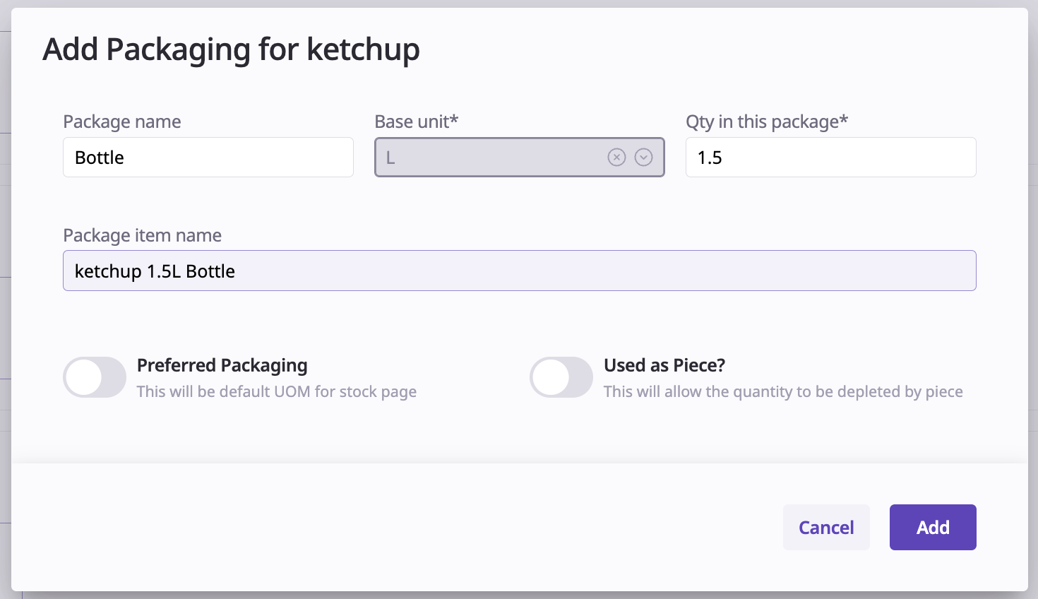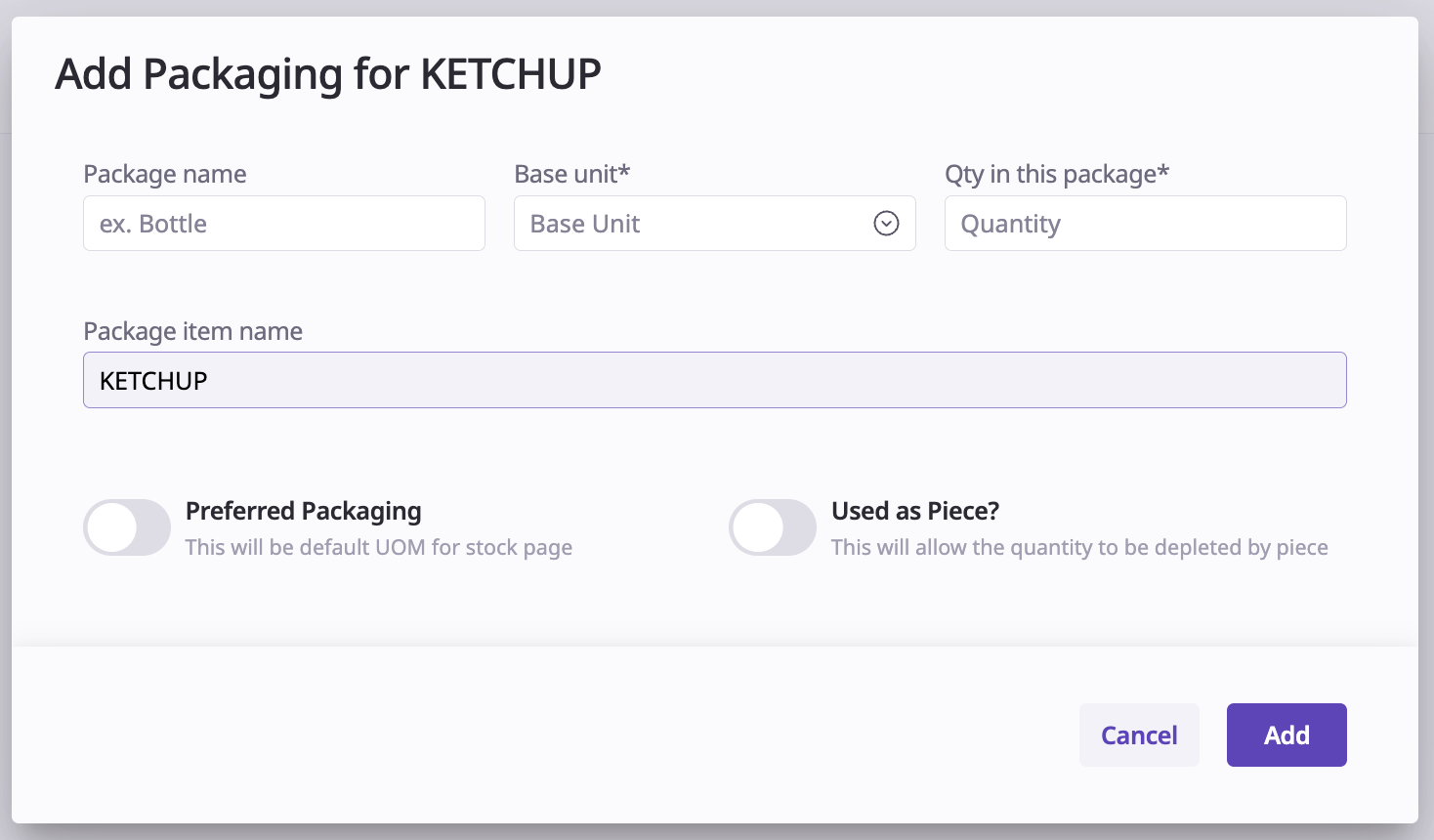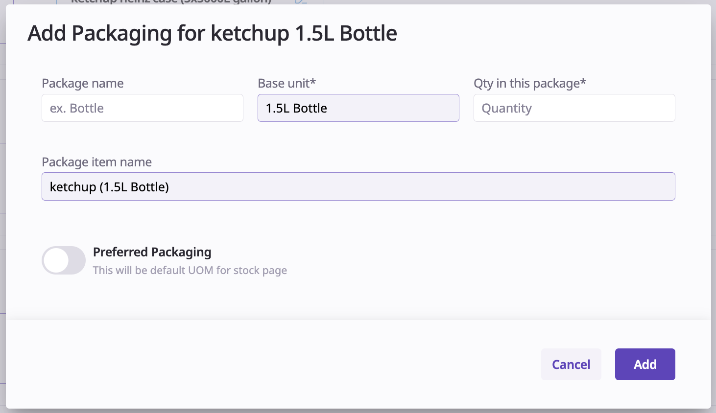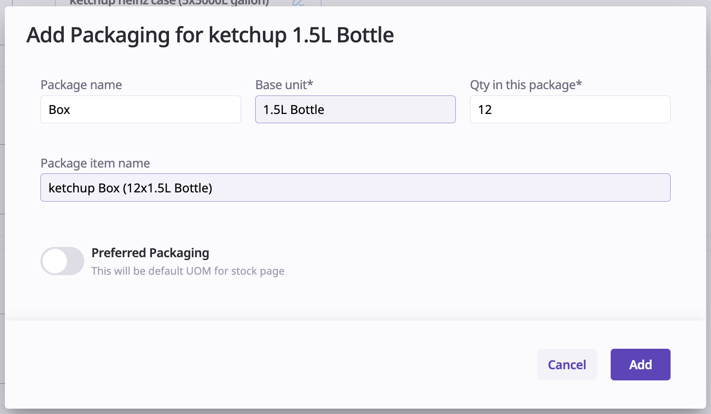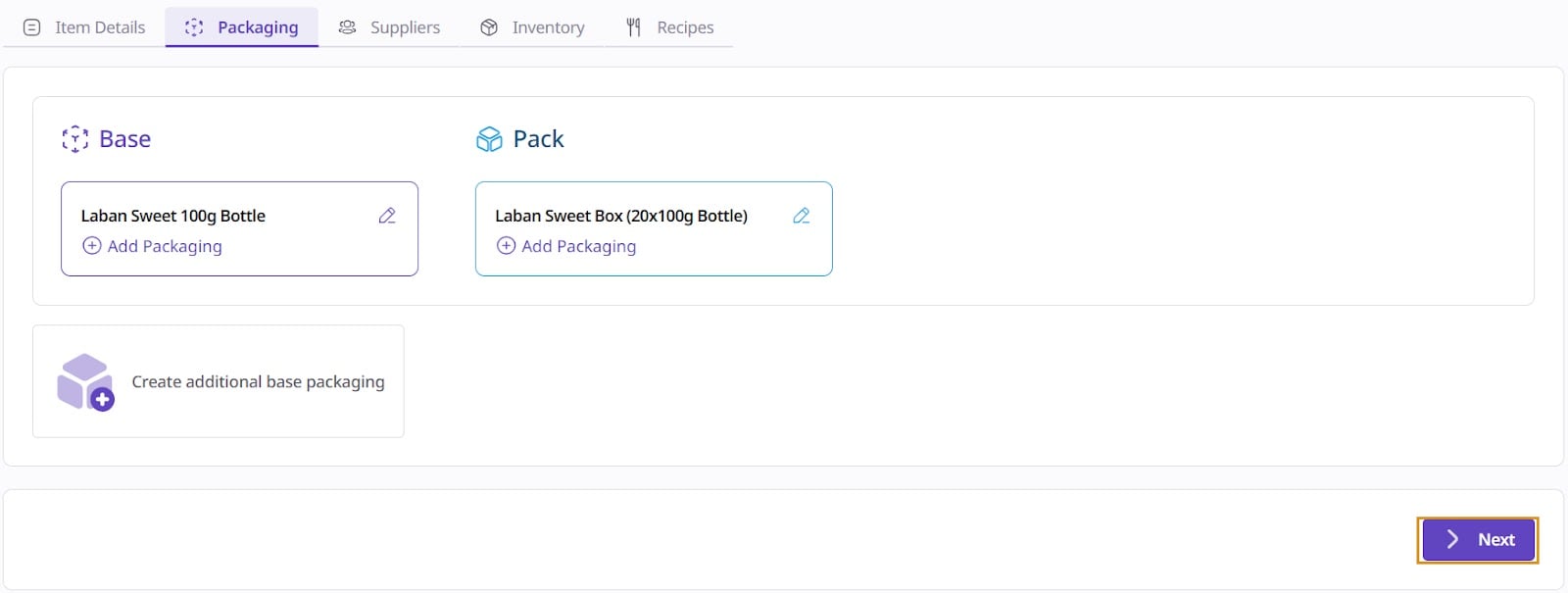 Clicking the ‘Add Packaging’ option on the Base Packaging allows you to make a pack for that Base Package.