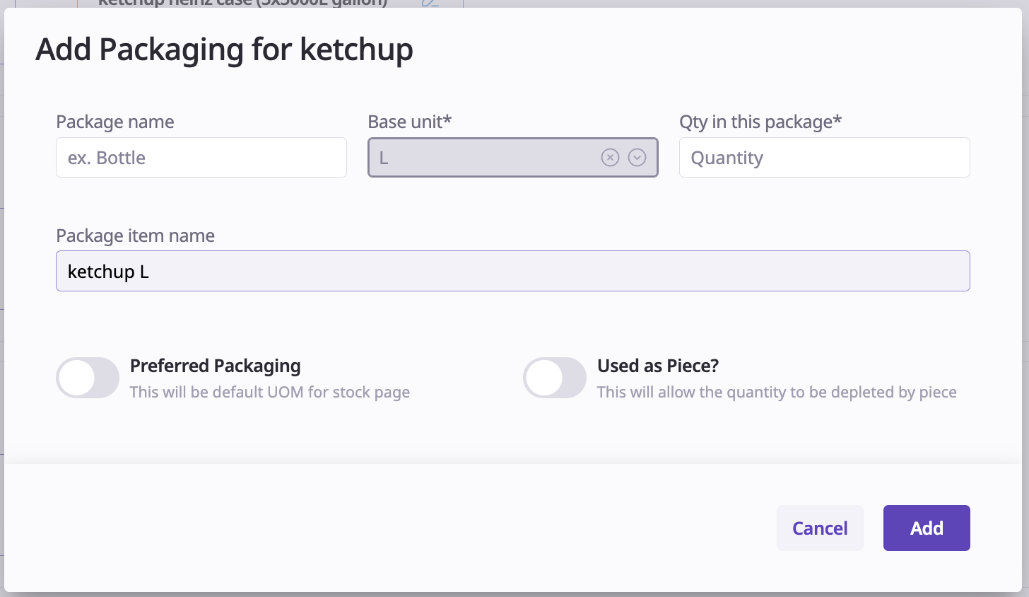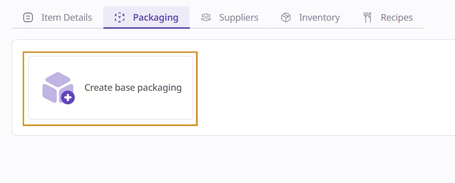 Within the "Packaging" tab, you can create all the package items you want under this base item. When you create your first package item (= base packaging), you must define the "Base Unit", which is the unit of measurement (UOM) by which you will store and consume this base item (e.g. "Kg" or "L") This "Base Unit" will always be the same for any other package items.