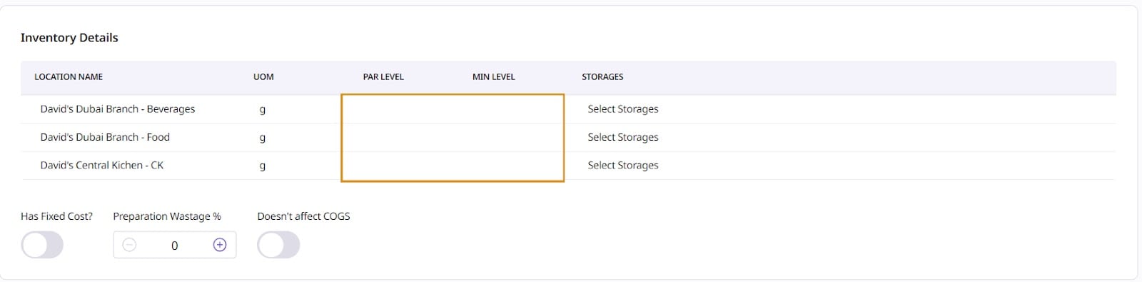Here, you may set up a Par Level and a Minimum Level for each location:
