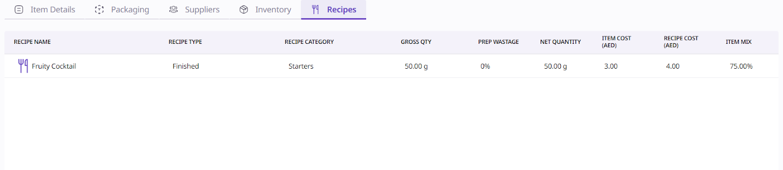 The "Recipes" tab displays a list of all recipes that include the item. Additional information about the recipes will also be displayed related to costing and preparation.