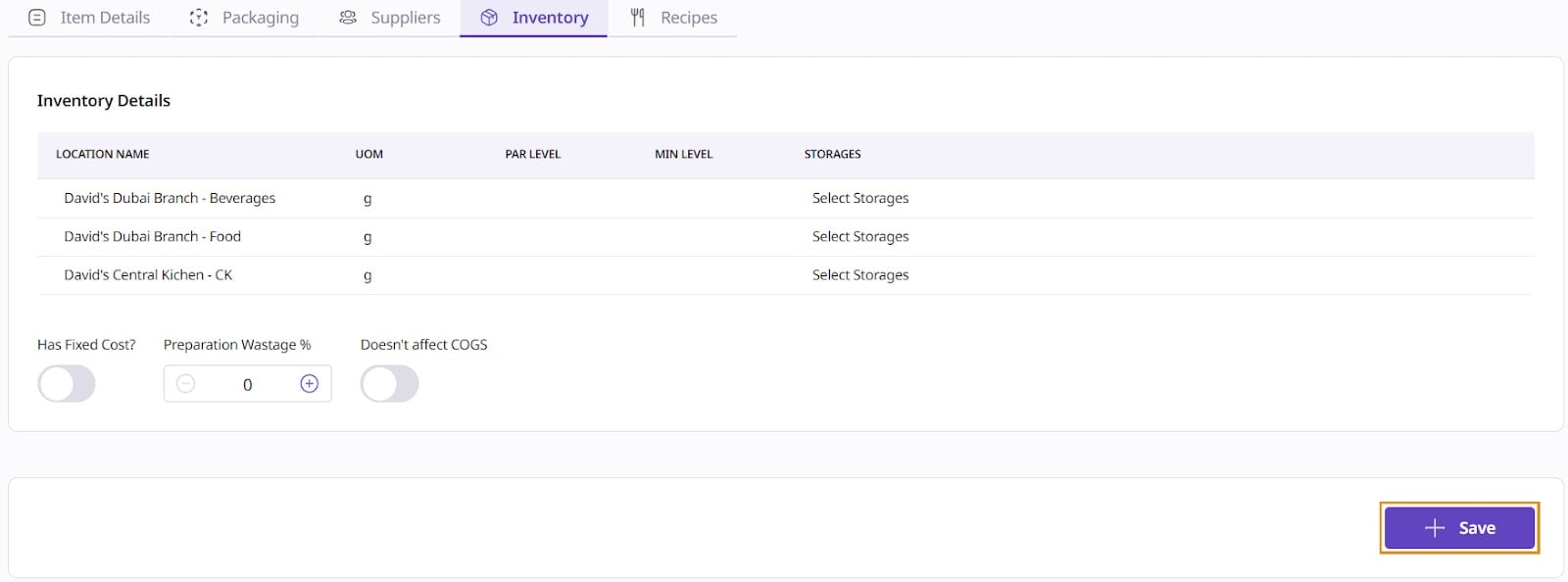 When you finish setting up suppliers, save your selection and move to the ‘Inventory’ tab by clicking on "Save".