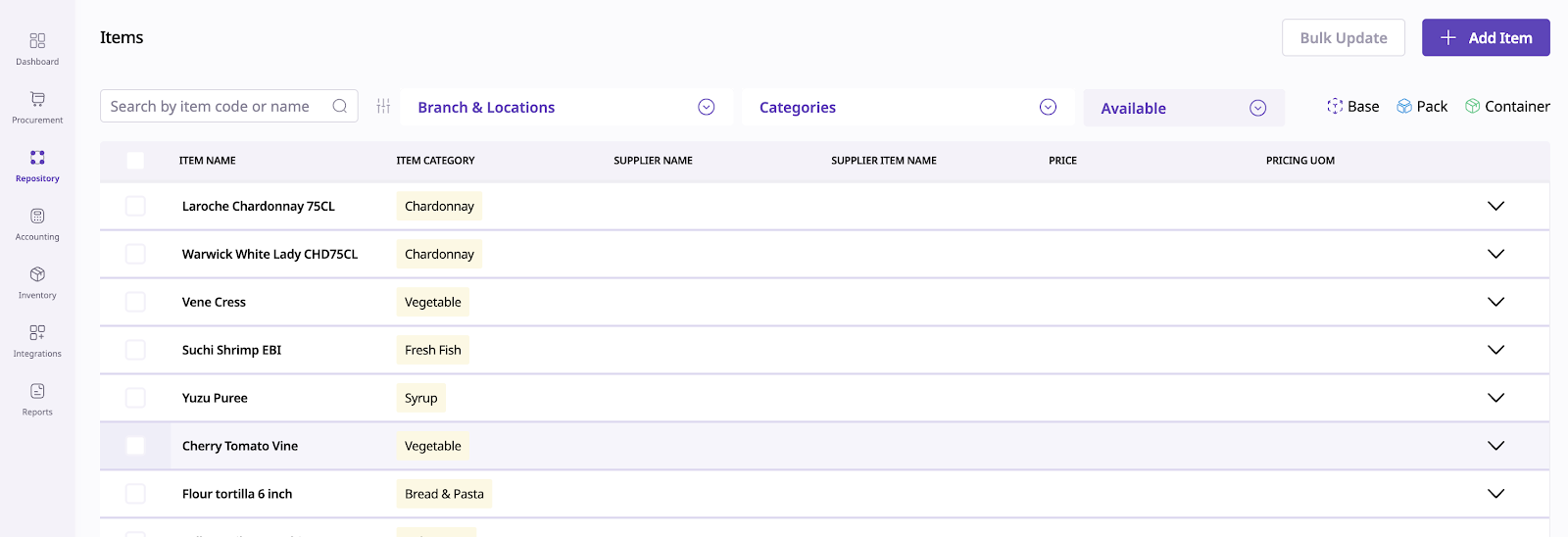EXAMPLE 1: If a restaurant group uses "Milk" as a non-key ingredient for a recipe, then it makes sense to put several package items with different milk brands/types under the same base item. In this way, for base item "Milk", you may have package item "Milk Almarai low-fat 1.5L Box" co-existing with base item "Milk Al Rawabi full-fat 1.5L Box". This is under the assumption that the type/brand of milk does not matter when consuming it. However, if milk is being used as a key ingredient (e.g. in a coffee bar), then it is recommended to create a base item for every type of specific milk; you may end up with a list of base items looking like:
