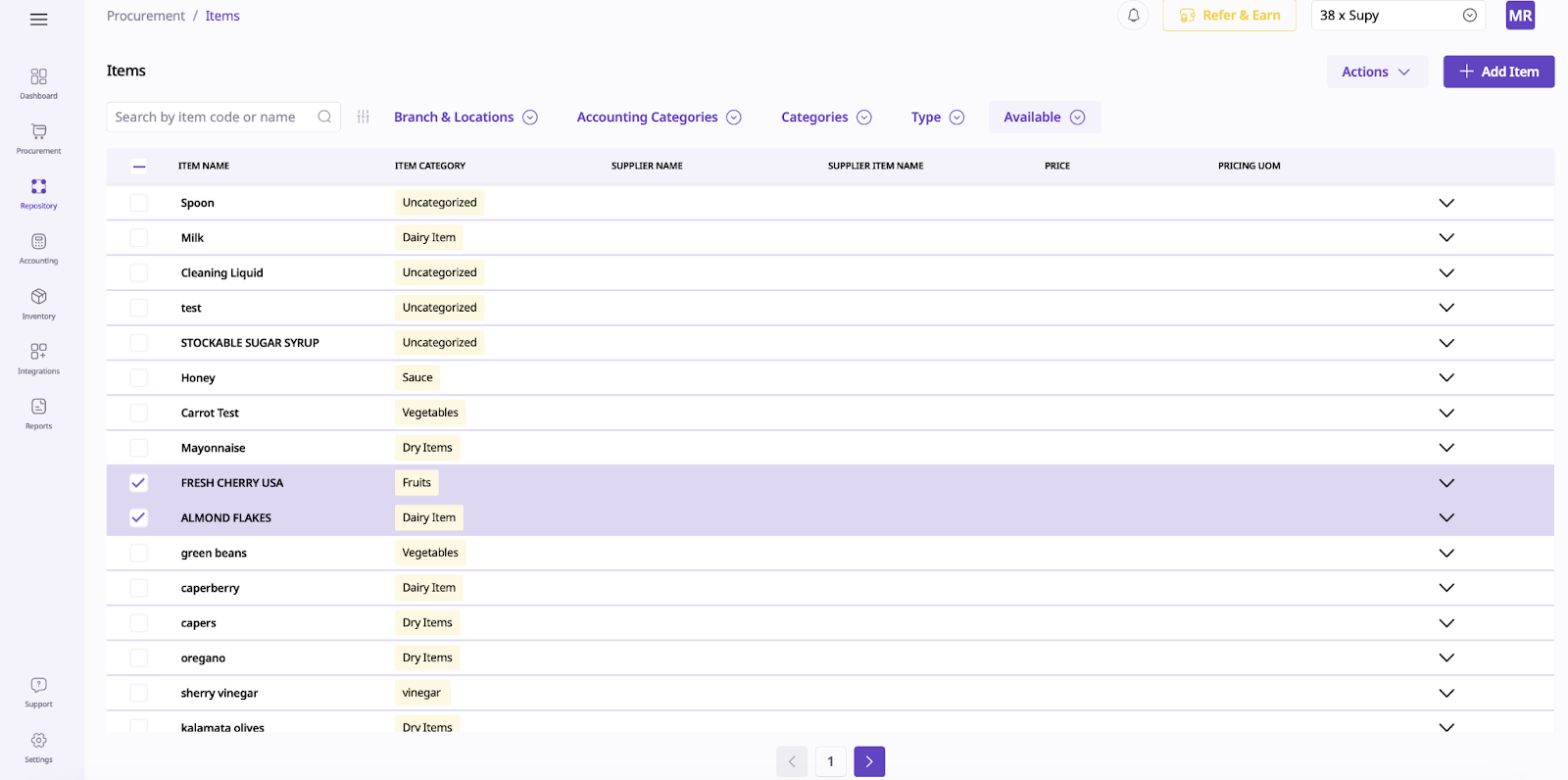 = the item, as sold by the supplier, which is linked to exactly one package item on Supy with a price specific to this supplier. For example a supplier item may be named "Large Chicken Aurora Box 1.5Kg" which will be linked to a package item "Chicken Breast 1.5 Kg Box" and may be priced at $12 for each such box.