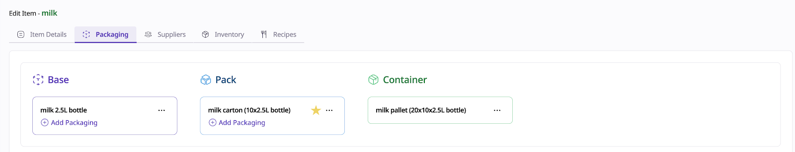 4. Next, when you proceed to the "Packaging" page, you can add 3 levels of how an item is packaged which is the Base, Pack and Container. Click on "+ Add Packaging" to add how an item is packaged in your inventory.