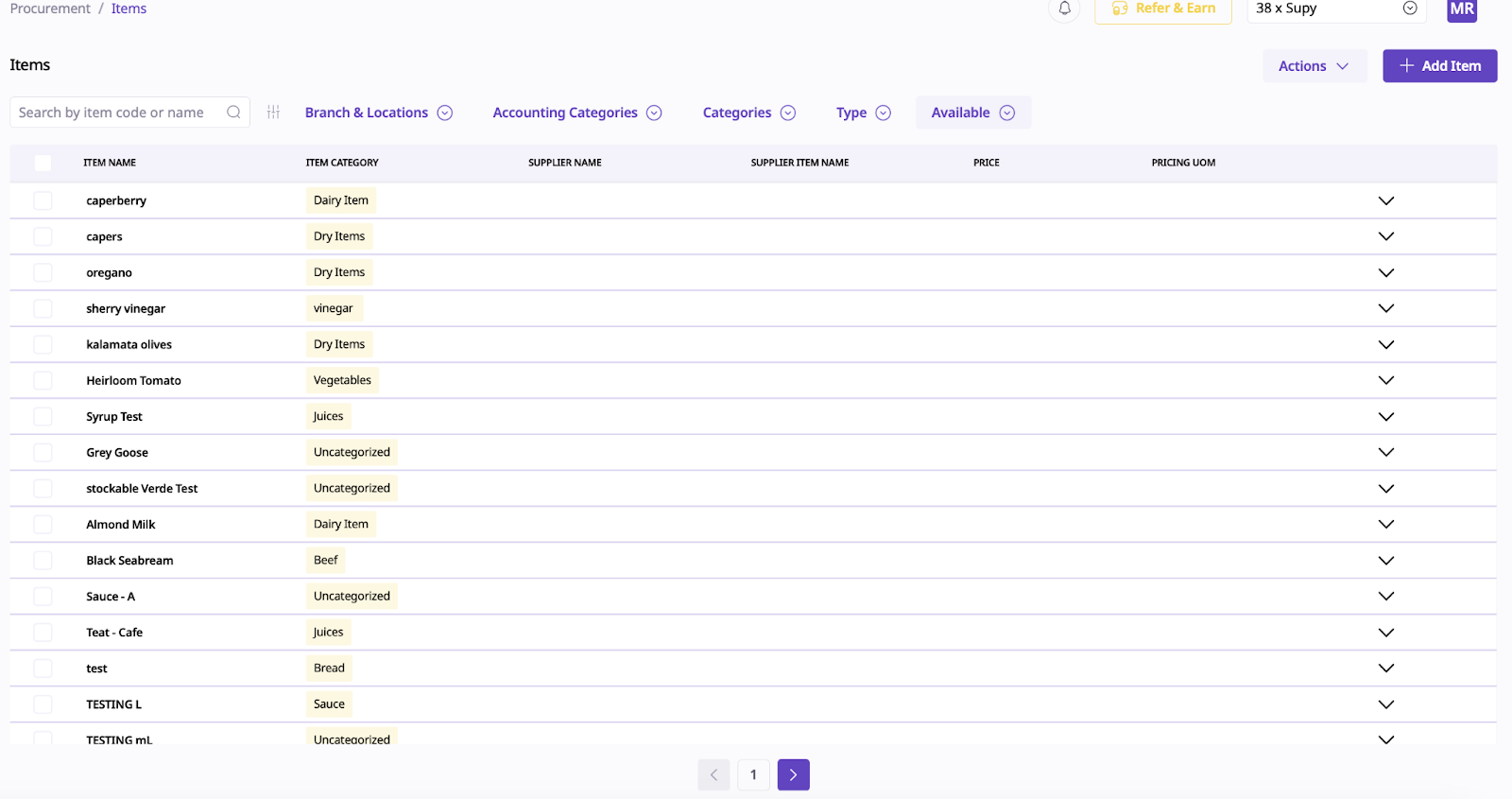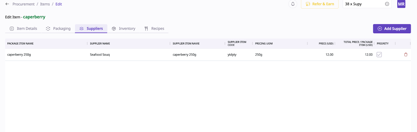5. In the "Suppliers" page, you can add a supplier and which item is ordered through that supplier along with the price, name, UoM, and priority. To edit a supplier package item, click and edit the values within the same row. To add a new supplier for the item, Click on "Click to add new supplier for this item" and fill in the column details.