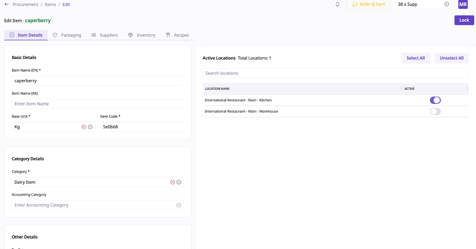 3. Click on an item from this page to open the item page details in which you can edit specific item details. Such as the Item Name (English and Arabic), Category, Accounting Category and the locations in which the item is activated or visible.