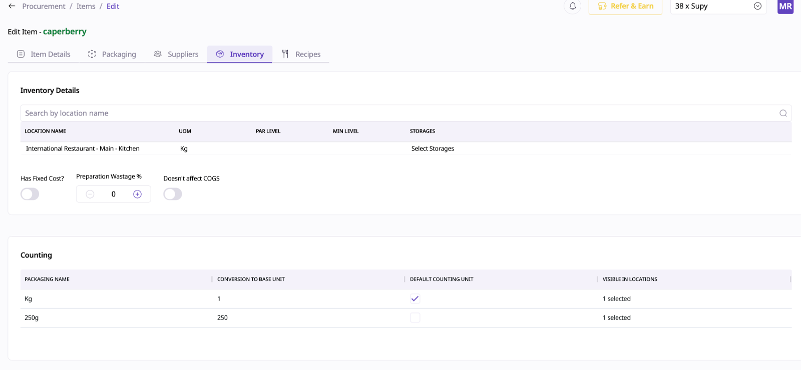 6. For the "Inventory" page, you can edit the Par Level, Min Level and Storage location of the item. Just click on each of the column details to edit the values.