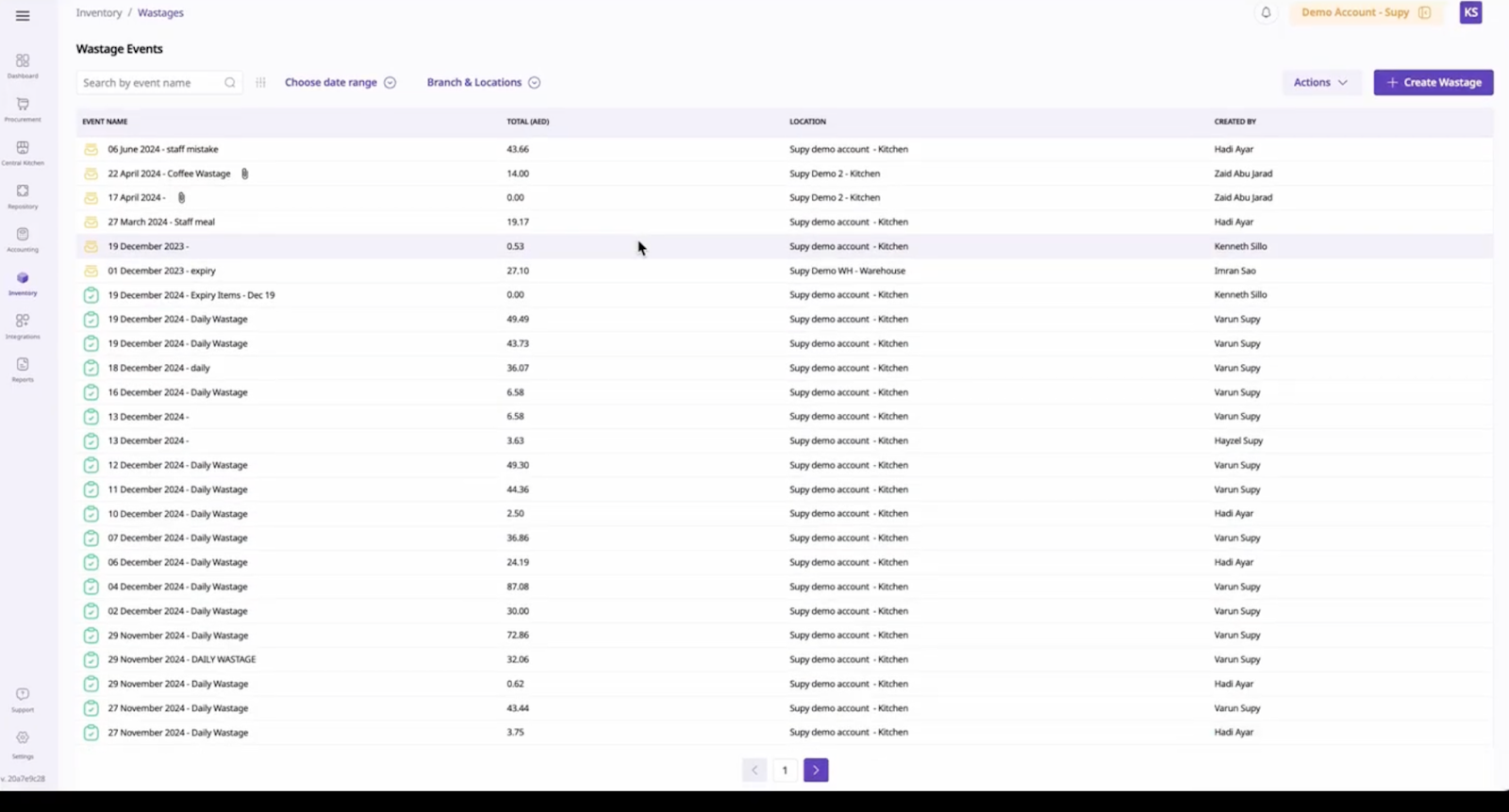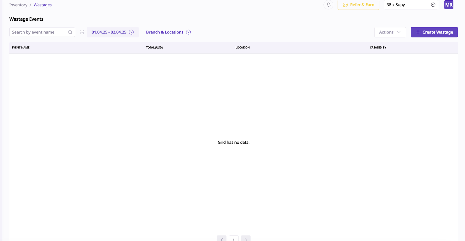 To create wastages in Supy, you have to go to the “Inventory” section and then select “Wastage” on the top right of the page.