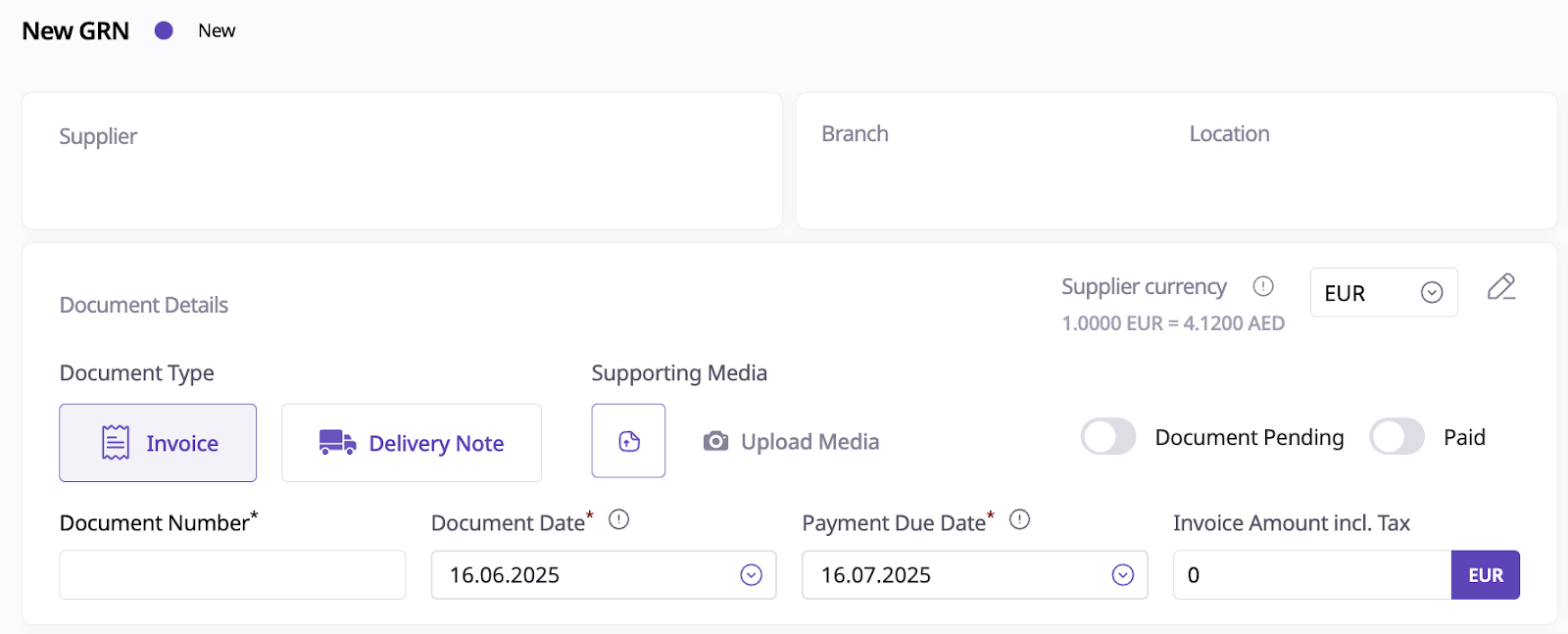 When creating a Purchase Order or recording a GRN for a supplier with an assigned currency, you’ll have two options: