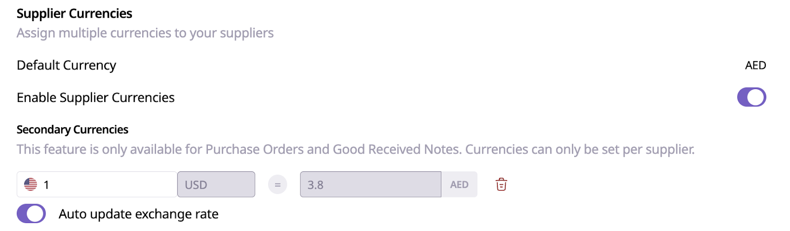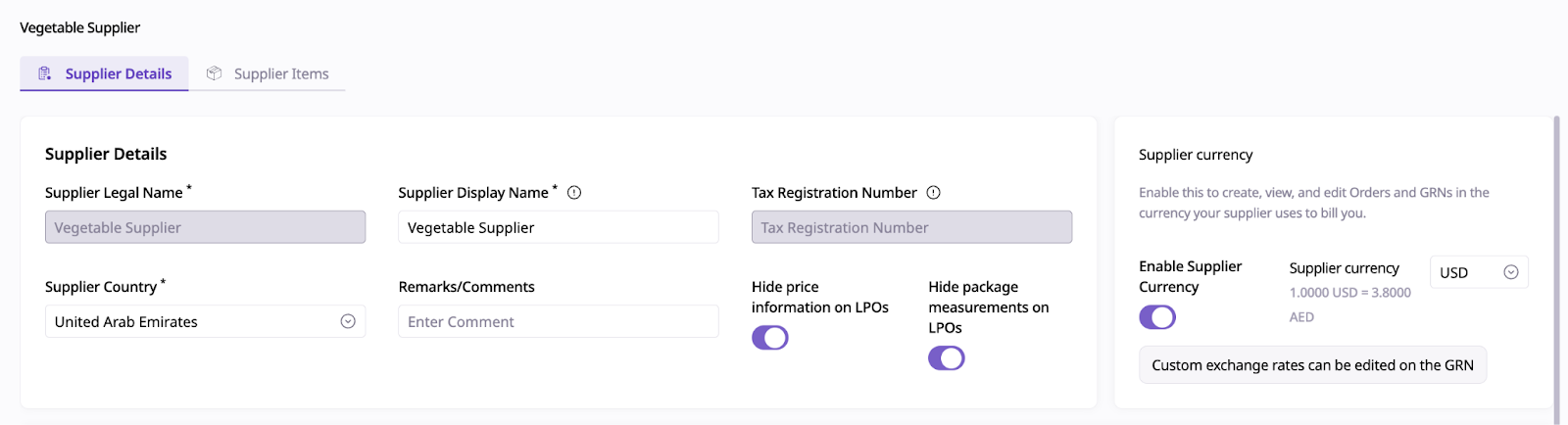 Managing supplier currencies is useful if you operate across multiple geographies and need to issue Purchase Orders (POs) and Goods Received Notes (GRNs) in the supplier’s local currency, while keeping all reports and dashboards consistent in your system’s main default currency.