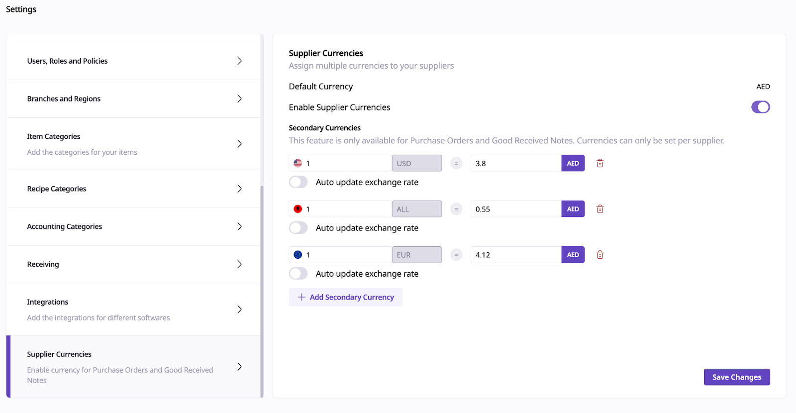 Navigate to Settings > Supplier Currencies.