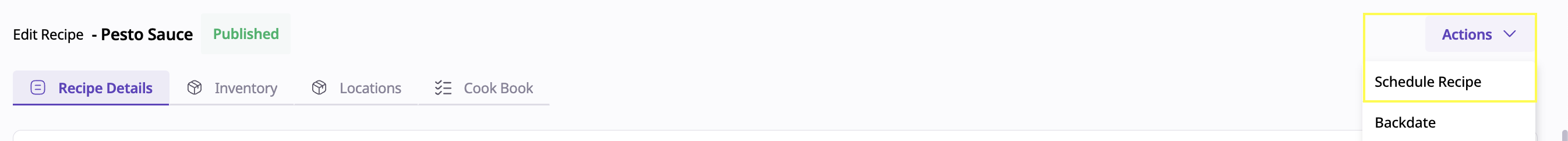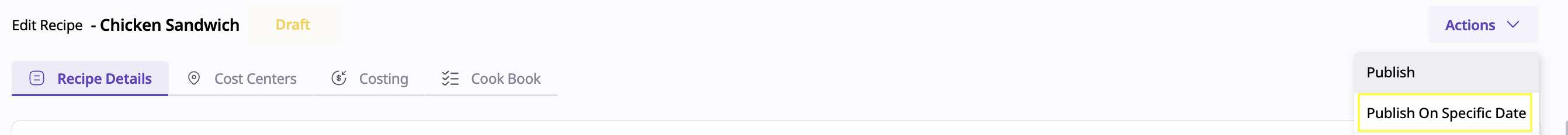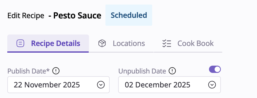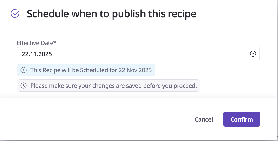 Recipe Scheduling introduces a new way to plan and publish recipe updates in advance. With this feature, you can now set a future date for a recipe to go live, helping your team stay organized and aligned across production, costing, and menu planning.