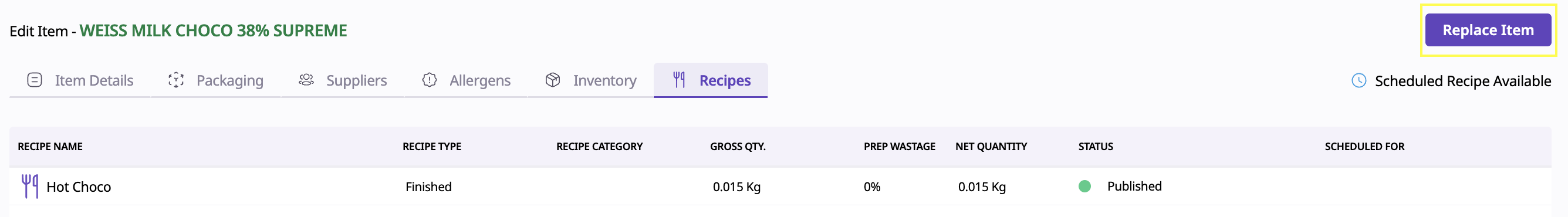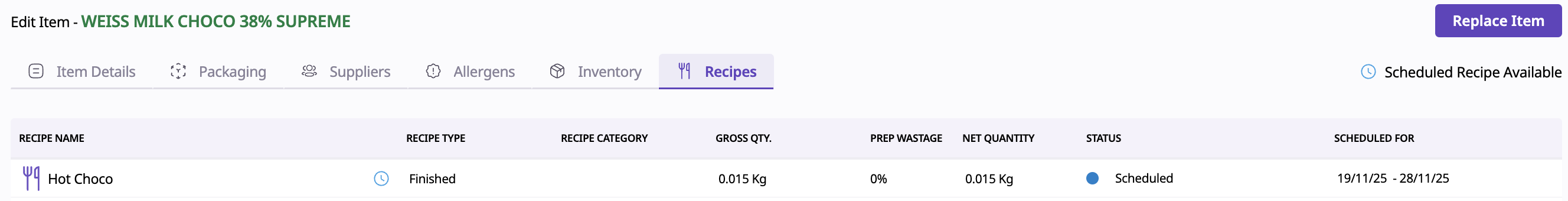 You can now schedule an item replacement across all recipes (excluding scheduled and draft versions) for a future date, with the option to automatically revert to the original item later — no manual updates required.