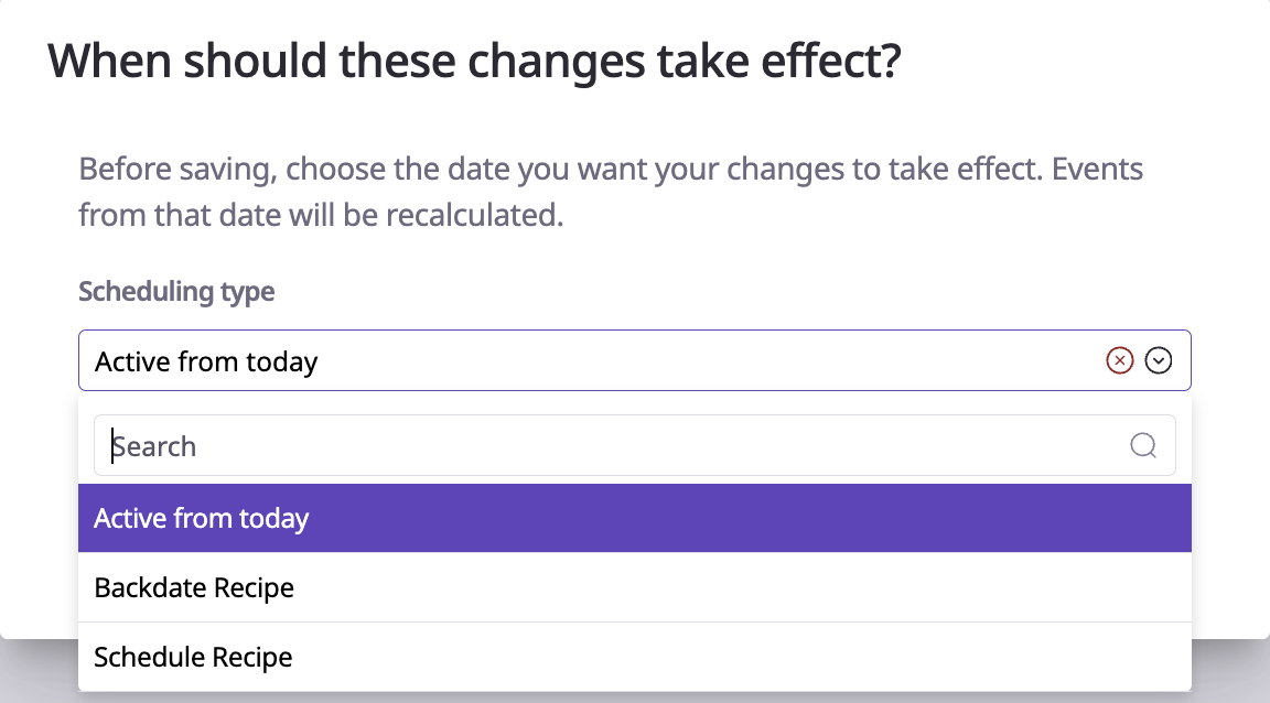Click Next, then select one of the options: Active from Today, Backdated Recipe, or Schedule Recipe.
