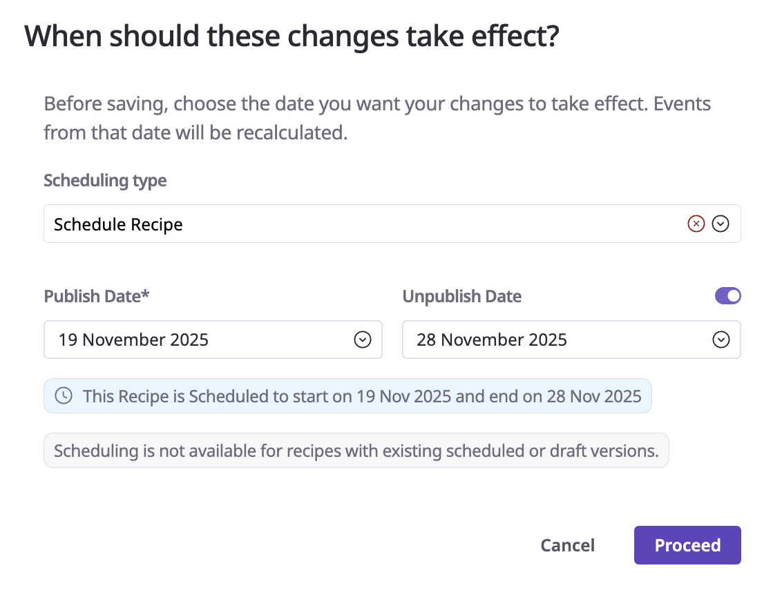 Set the Publish and Unpublish dates. (Scheduling is not available for recipes with existing scheduled or draft versions.)