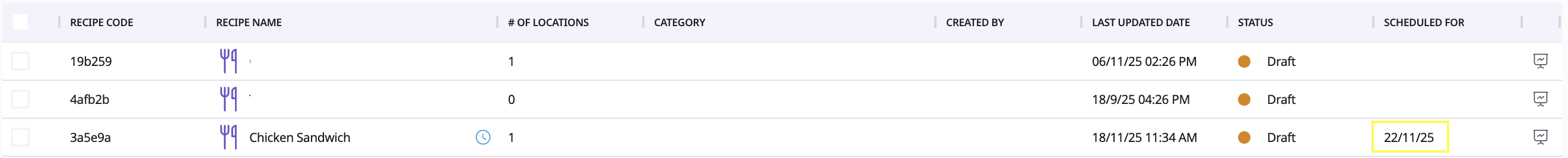 Once scheduled, the recipe’s status shows as “Scheduled”, and the selected date appears under Scheduled For in your recipe list.