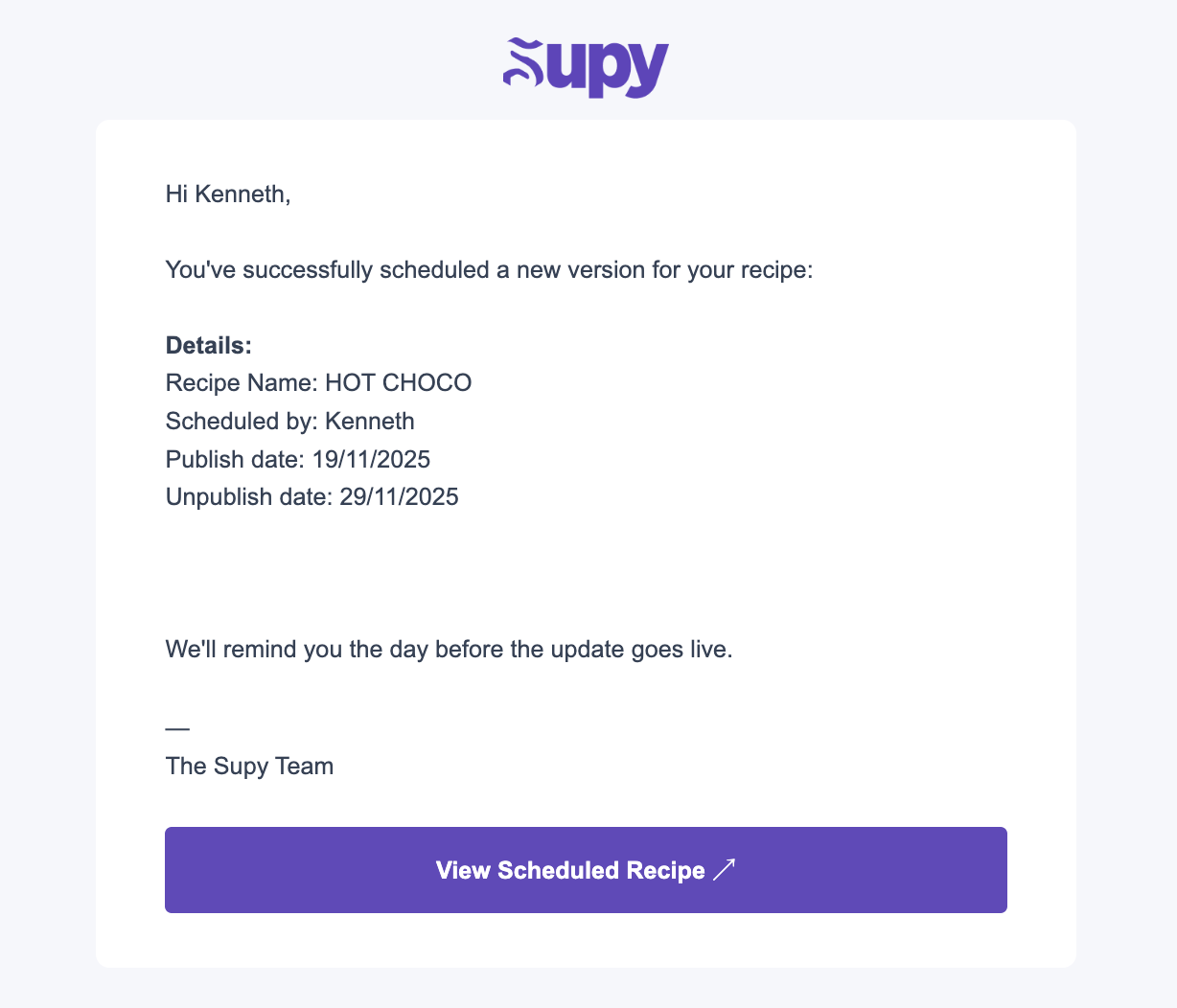 Supy will automatically make the recipe live on Monday morning—no manual action needed!