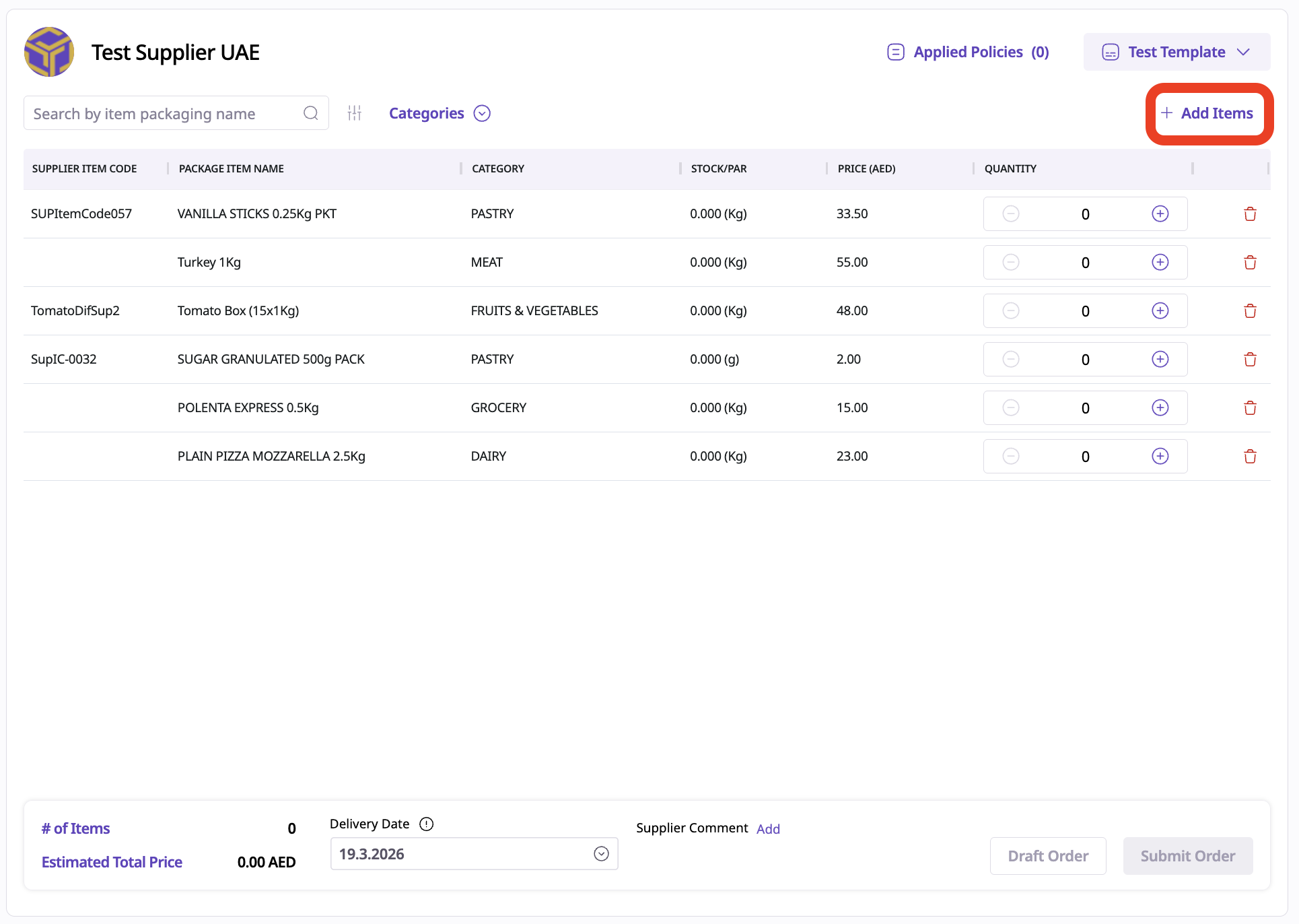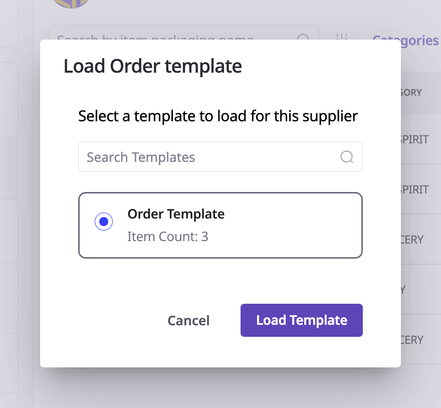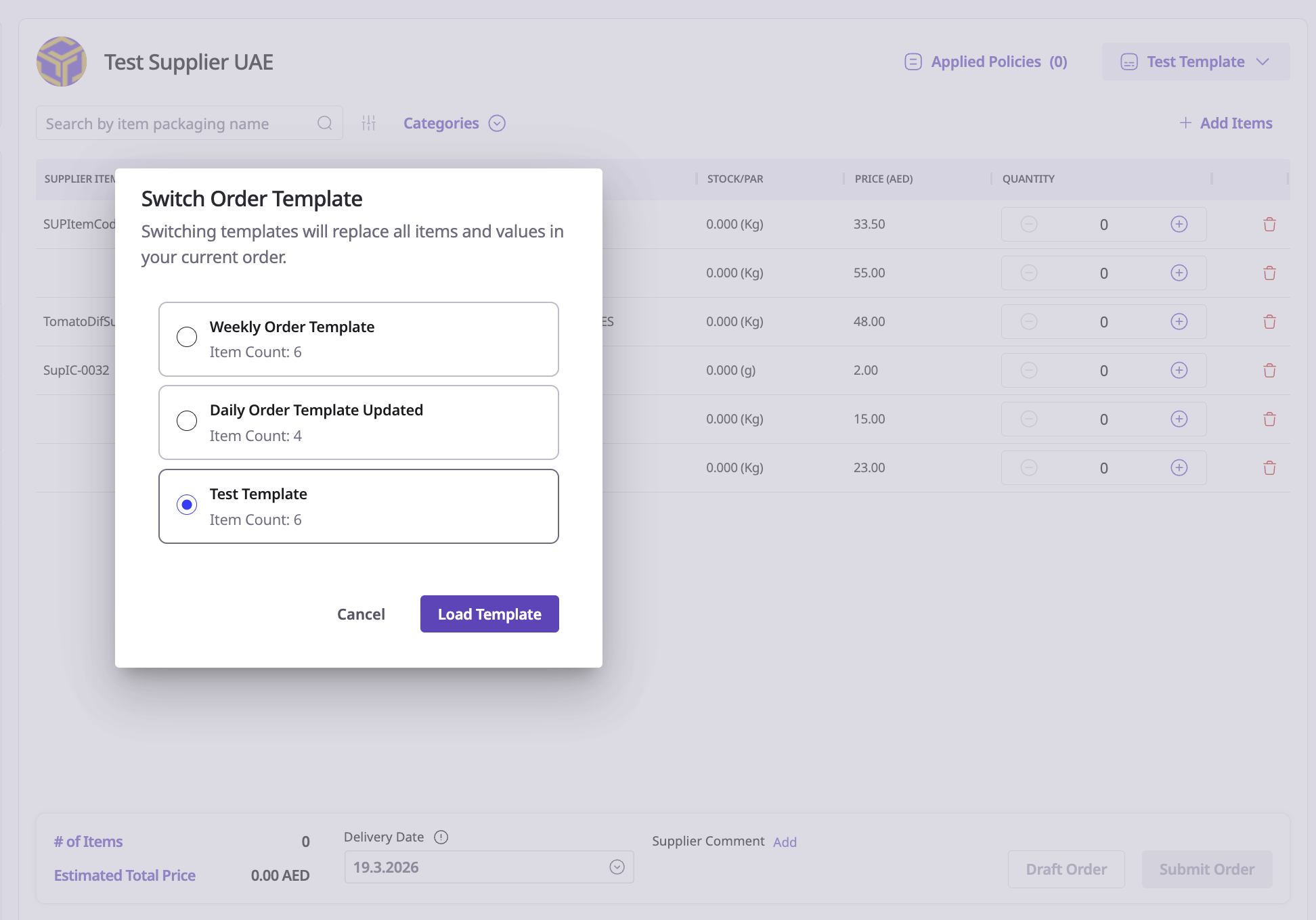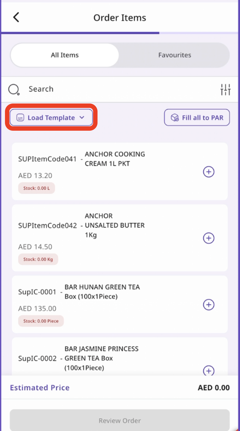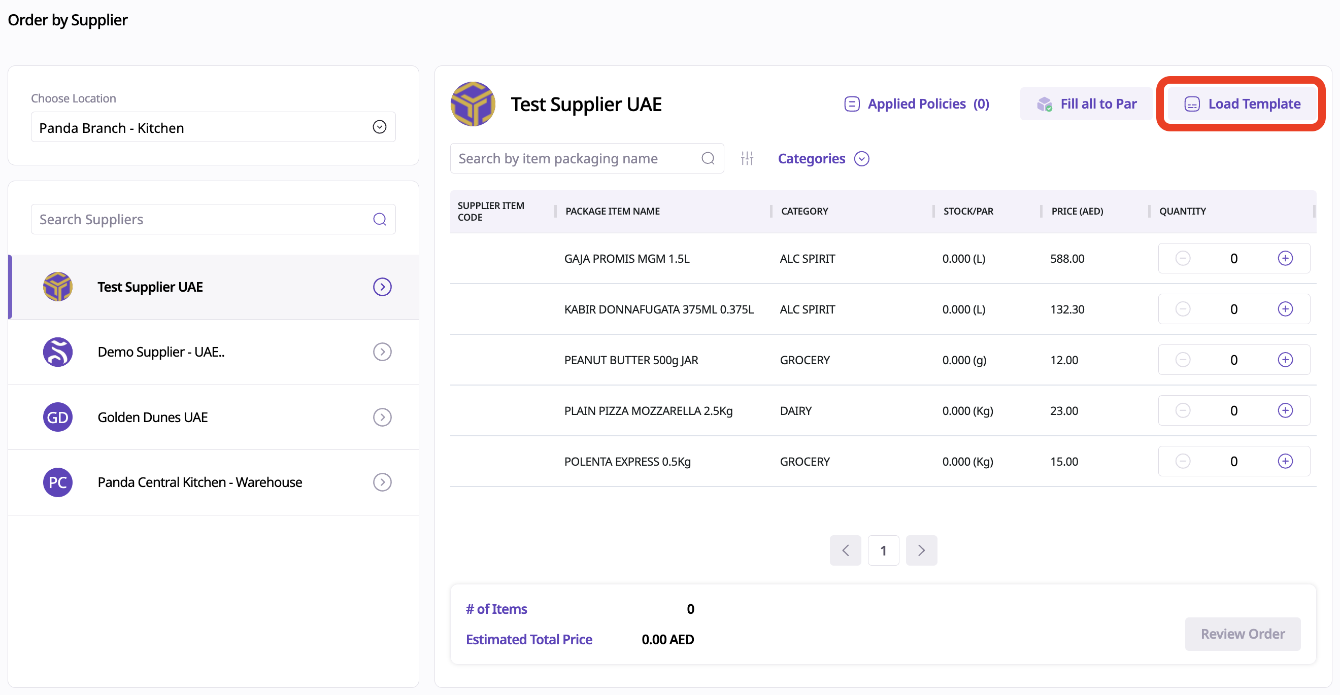 Click the Load Template button that appears above the supplier items list.