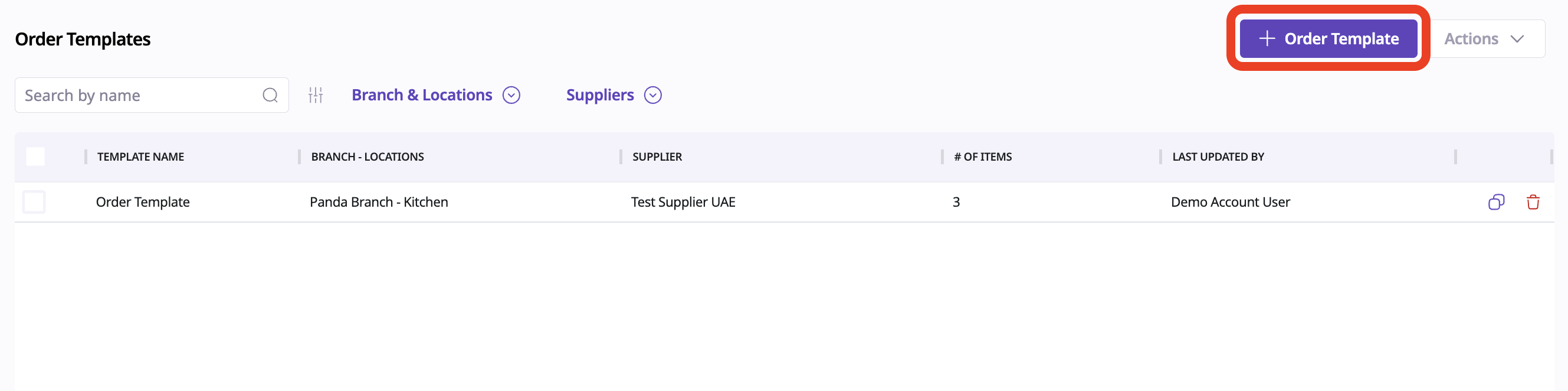 The main Order Templates screen shows all saved templates for your branch: