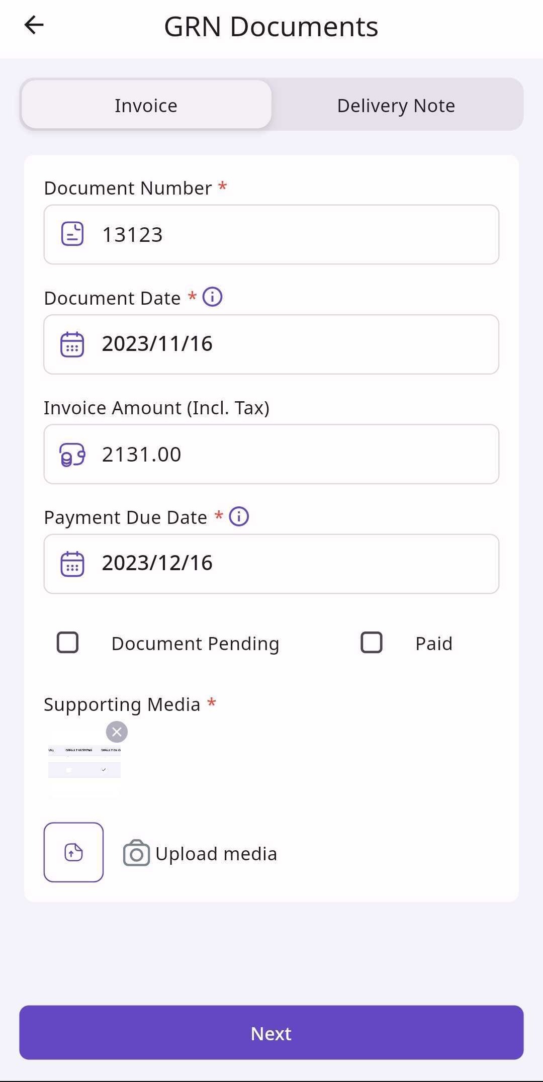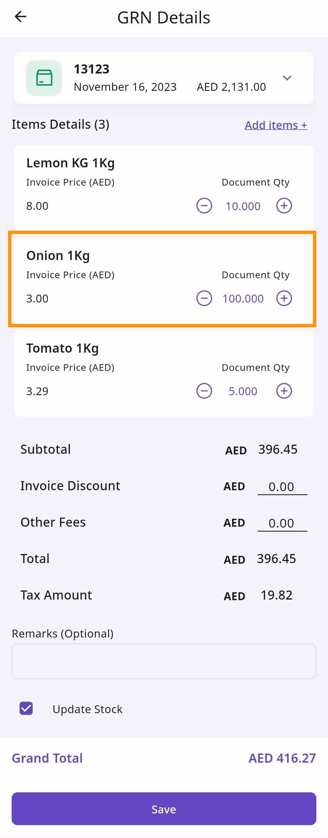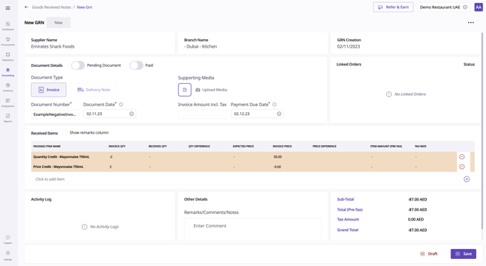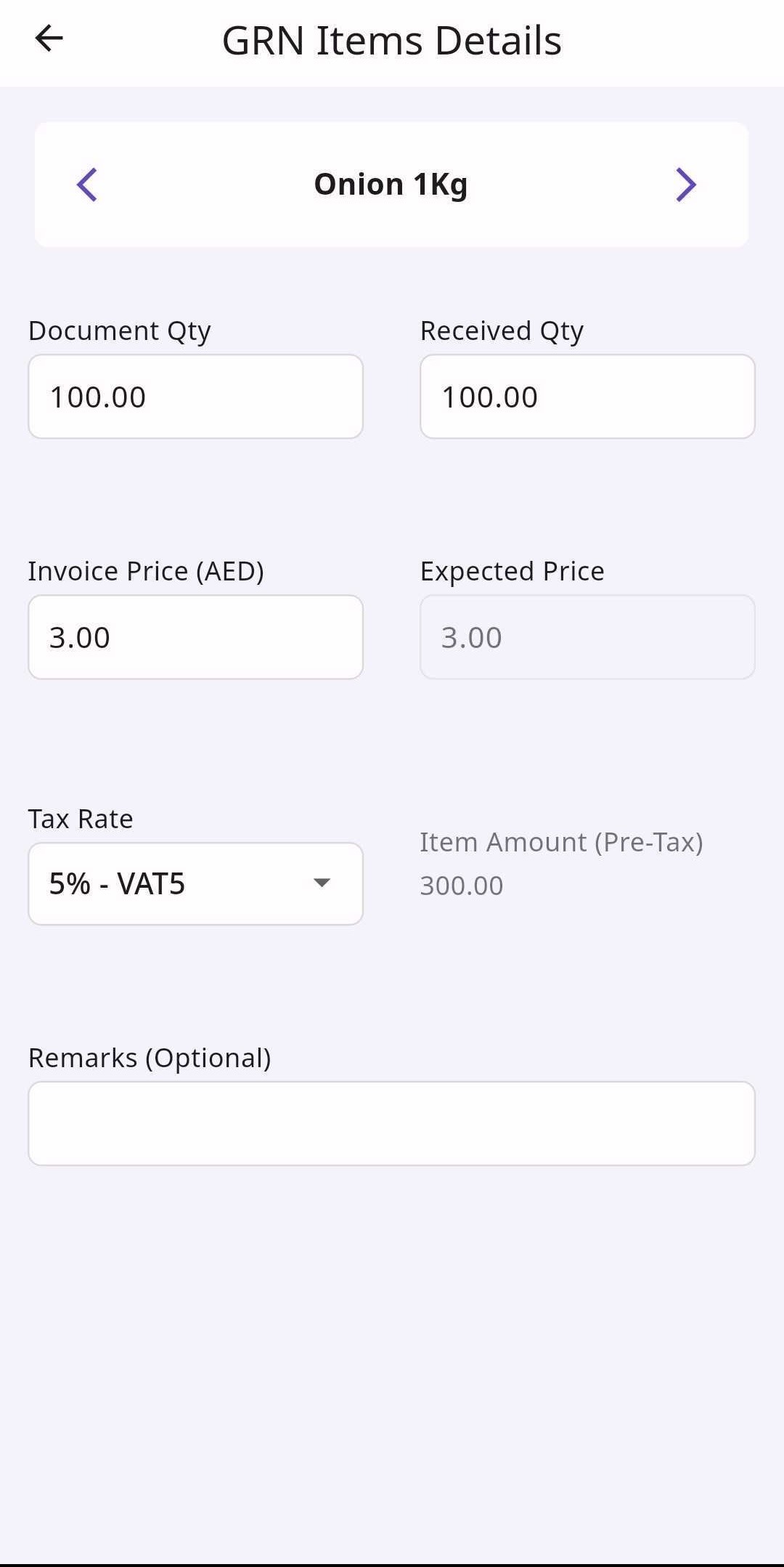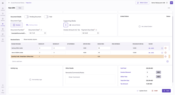 In this case, when creating the GRN, it is important to enable the "Pending Document" toggle to flag that a (new) document still needs to be provided by the supplier. When that happened, the corrected document should be uploaded on the GRN and the values can be edited (e.g. change invoice price to 30 AED instead of 35 AED, in above example for olive oil).