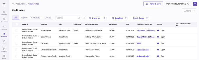 Origin Document No.: the document number of the GRN from which the credit note was created (clicking on this will redirect you to the GRN detail page)
