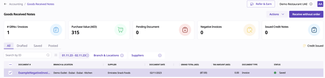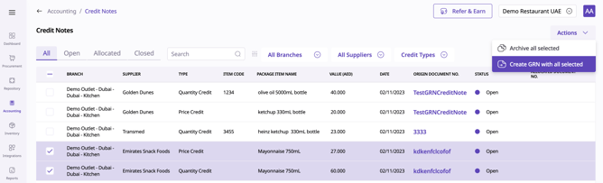 Selecting one or more credit notes on "open" status from the same location & supplier in the credit notes listing page and creating a new GRN with those credit notes.