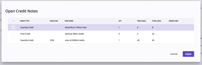 This open a popup with all credit notes for the same location & supplier which are on "open" status. You can select one or more of these and click "apply".