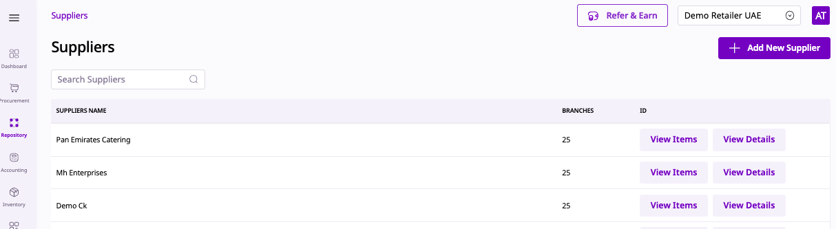 Access your Supy portal and click on the "Repository" tab. From the options that appear, select "Suppliers."