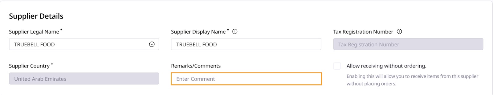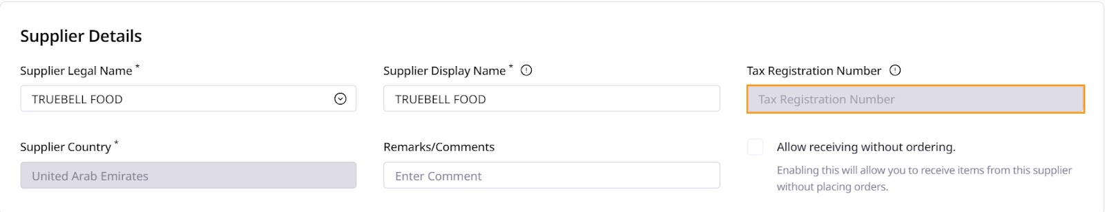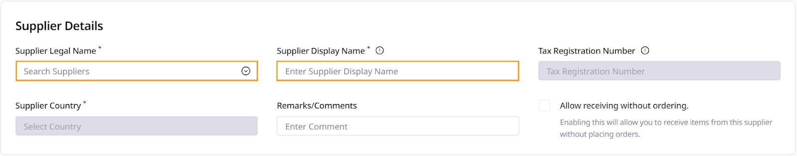 In the "Supplier Legal Name" field, you can either search for supplier's from our existing database (to simplify the process) or you can fill out the supplier's legal name yourself.