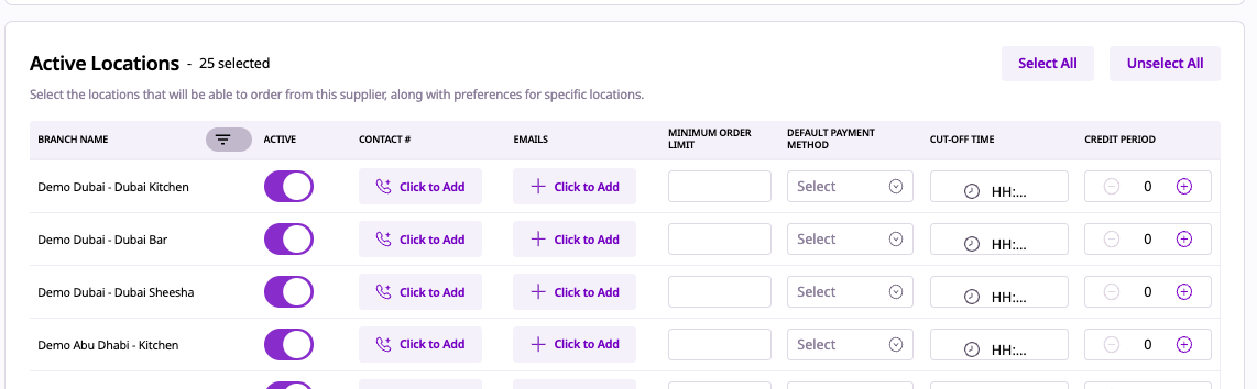 In this section, you can select which locations are "active" for this supplier, meaning that these locations will be able to submit orders and create goods received notes (GRNs) from these suppliers.