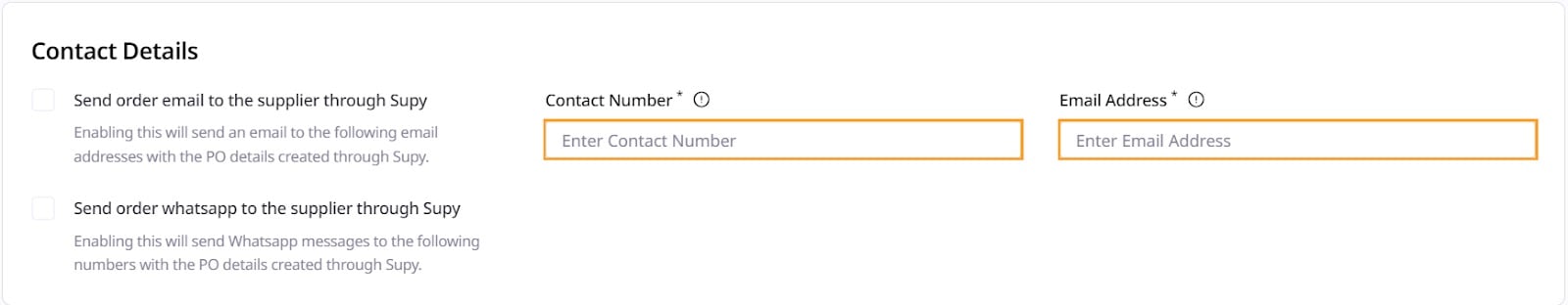 As mentioned in the introduction: when you submit an order, you have the ability to send an automated email and/or Whatsapp message to the supplier. The purpose of adding supplier emails and/or Whatsapp numbers in this contact details section is to enable such order messages. When you enter the inputs, hit "enter" so that it is added to the list; you can add one or multiple.